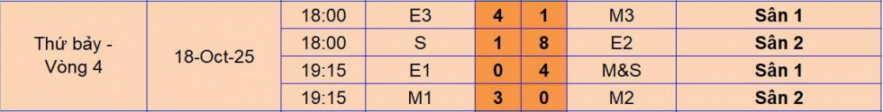 Ngay trong ngày thi đấu đầu tiên, các khán giả tại sân Làng Bằng B đã được chứng kiến những màn trình diễn mãn nhãn – nơi E3 và E2 cùng giành những chiến thắng thuyết phục, trong khi cuộc đối đầu tâm điểm giữa hai “ông lớn” E1 và M&S đã thực sự làm bùng nổ cảm xúc trên sân cỏ. Những diễn biến kịch tính, những bàn thắng đẹp mắt và tinh thần thi đấu hết mình đã khiến vòng 4 SCL 2025 trở thành một trong những vòng đấu đáng nhớ nhất của mùa giải.
