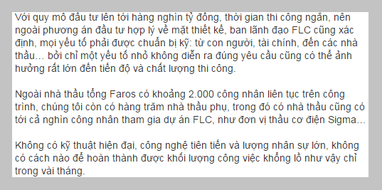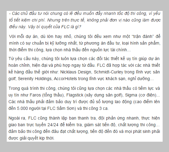 Với mỗi dự án của Tập đoàn FLC, dù quy mô lớn hay nhỏ, dù trong quá khứ hay hiện tại, người ta luôn thấy cụm từ: "Thi công vượt tiến độ", "Thần tốc" đi kèm, dù tập đoàn này không định vị mình gắn liền với tốc độ. Đại diện FLC chia sẻ, sự thành công nằm ở sự lựa chọn phù hợp ngay từ khi lên phương án đầu tư và khâu chuẩn bị kỹ lưỡng cho mọi vấn đề.