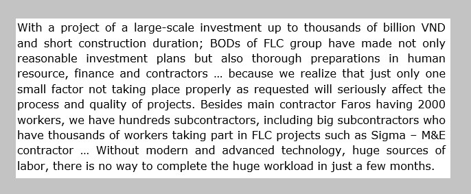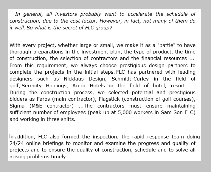 With each project of FLC group, whether large or small, whether in the past or present, people always find the phrase: "Construction Ahead of Schedule” “lightning speed”, though this group did not locate itself being tied to speed. FLC representative said that their success based on their matching choices since the initial steps of making investment plans and thorough preparations for every problem.