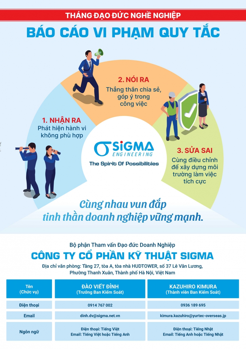 Trong trường hợp phát hiện những dấu hiệu hoặc hành vi chưa phù hợp, Sigma khuyến khích nhân viên mạnh dạn phản ánh với cấp trên hoặc thông qua các kênh tư vấn chính thức. Chính tinh thần minh bạch và trung thực này đã, đang và sẽ tiếp tục là nền móng giúp Sigma duy trì môi trường làm việc lành mạnh, công bằng và nhân văn.