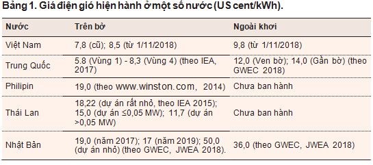 Các thách thức lớn nhất hiện nay là giá mua điện gió và cơ chế chính sách hỗ trợ mua bán điện gió cho các nhà sản xuất và tiêu thụ. Giá mua điện gió ở Việt Nam hiện nay là thấp so với nhiều nước trên thế giới (bảng 1). Giải pháp trước mắt là ban hành chính sách giá mua điện gió phù hợp hơn, bao gồm cả các loại hình tua bin trên bờ hay ngoài khơi như Quyết định số 39/2018/QĐ-TTg. Các giải pháp tiếp theo là giá mua theo quy mô lớn, nhỏ của dự án, theo loại công nghệ và trình độ ứng dụng khoa học kỹ thuật trong lưu trữ và phụ trợ điều tiết lưới điện mà dự án sử dụng. Các giải pháp dài hạn và bền vững hơn như ở Cộng hòa Ireland và một số nước khác đã thực hiện là ban hành giá sàn hợp lý cho nhà sản xuất điện và tiến hành đấu thầu công khai giữa nhà sản xuất và phân phối điện. Việc đấu thầu có thể diễn ra định kỳ hàng tuần, thậm chí hàng ngày dựa vào công nghệ tiên tiến trong dự báo nhu cầu tiêu thụ điện.