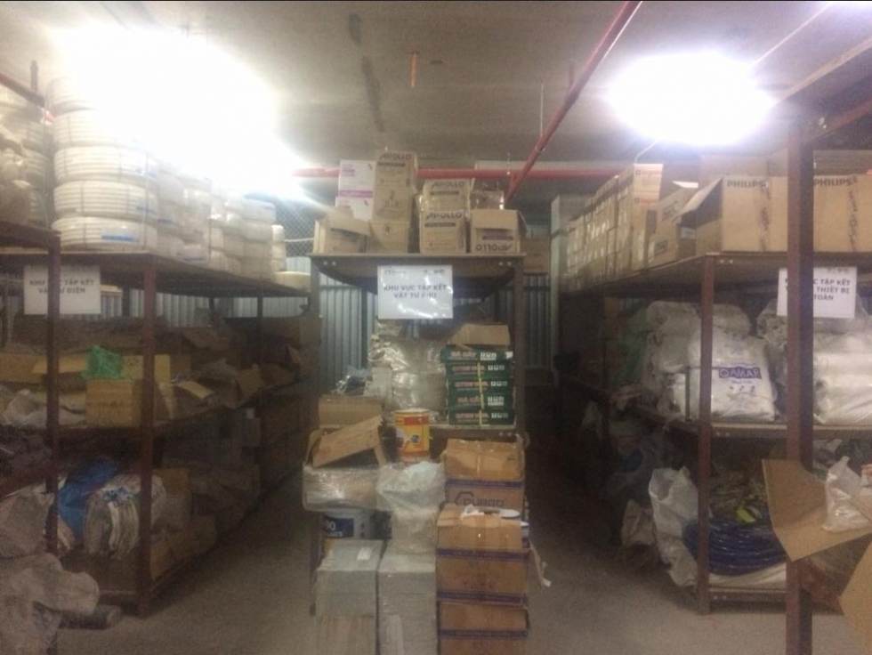 Vật tư tập kết tại khu vực nhà kho được bố trí gọn gàng, ngăn nắp
