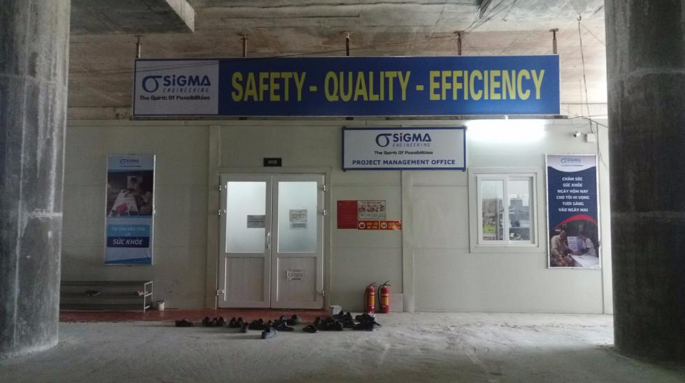 Bên ngoài văn phòng công trường dự án với tôn chỉ “An toàn – Chất lượng – Hiệu quả”