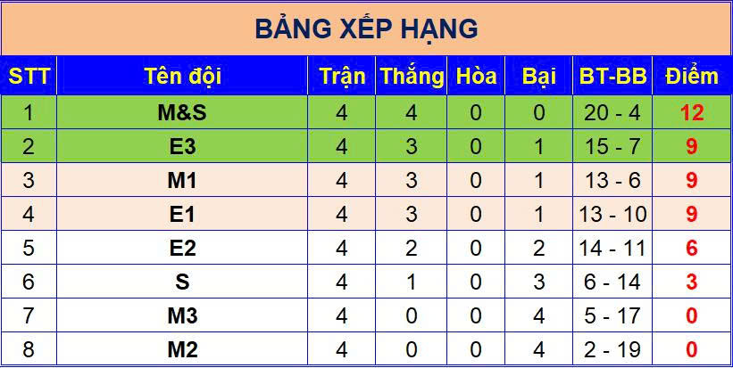 Ngay trong ngày thi đấu đầu tiên, các khán giả tại sân Làng Bằng B đã được chứng kiến những màn trình diễn mãn nhãn – nơi E3 và E2 cùng giành những chiến thắng thuyết phục, trong khi cuộc đối đầu tâm điểm giữa hai “ông lớn” E1 và M&S đã thực sự làm bùng nổ cảm xúc trên sân cỏ. Những diễn biến kịch tính, những bàn thắng đẹp mắt và tinh thần thi đấu hết mình đã khiến vòng 4 SCL 2025 trở thành một trong những vòng đấu đáng nhớ nhất của mùa giải.